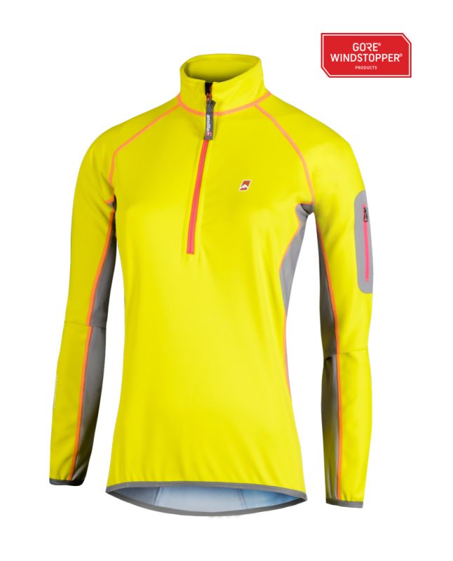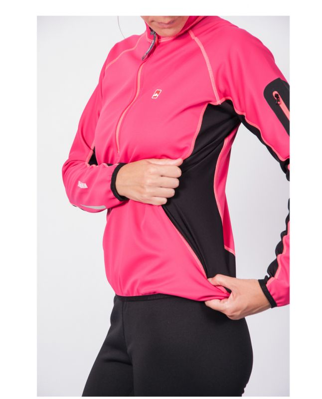 Poleron de dama, diseñado para ciclismo u otro deporte aeróbico de alta exigencia, donde se necesita protección contra el viento, transportar poco peso, tener movilidad y confort. Tejidos Gore-tex Infinium® Soft Shell y Polartec® Power Stretch.